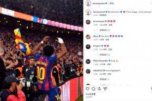 亚马尔也在赛后通过社媒晒出自己在诺坎普坐广告牌的霸气庆祝照,并配文:“巴塞罗那是红蓝色的💙❤️!!和往常一样,是时候接受现实了。”
